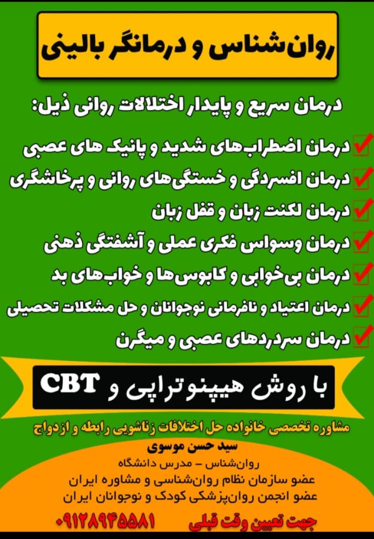 اگر به دنبال درمان تخصصی و علمی برای مشکلاتی مانند سردرد عصبی، میگرن، لکنت زبان، اضطراب، وسواس، فوبیا و اختلالات رفتاری نوجوانان هستید، دکتر سید حسن موسوی با روشهای هیپنوتراپی و روانشناسی بالینی، یکی از بهترین انتخابها در تهران است. خدمات حضوری، تلفنی و آنلاین، امکان دسترسی سریع و راحت به درمان حرفهای را فراهم میکند. با مراجعه به دکتر موسوی، میتوانید از تخصص یک روانشناس و هیپنوتراپیست بینالمللی بهرهمند شوید و کیفیت زندگی و سلامت روان خود و خانواده خود را بهبود بخشید.
