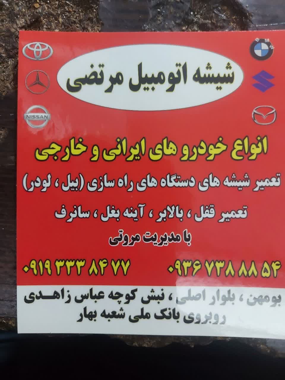 آدرس:بومهن بلوار اما خمینی نبش خیابان عباس زاهدی روبه روی بانک ملی شعبه ی بهار شیشه اتومبیل مروتی