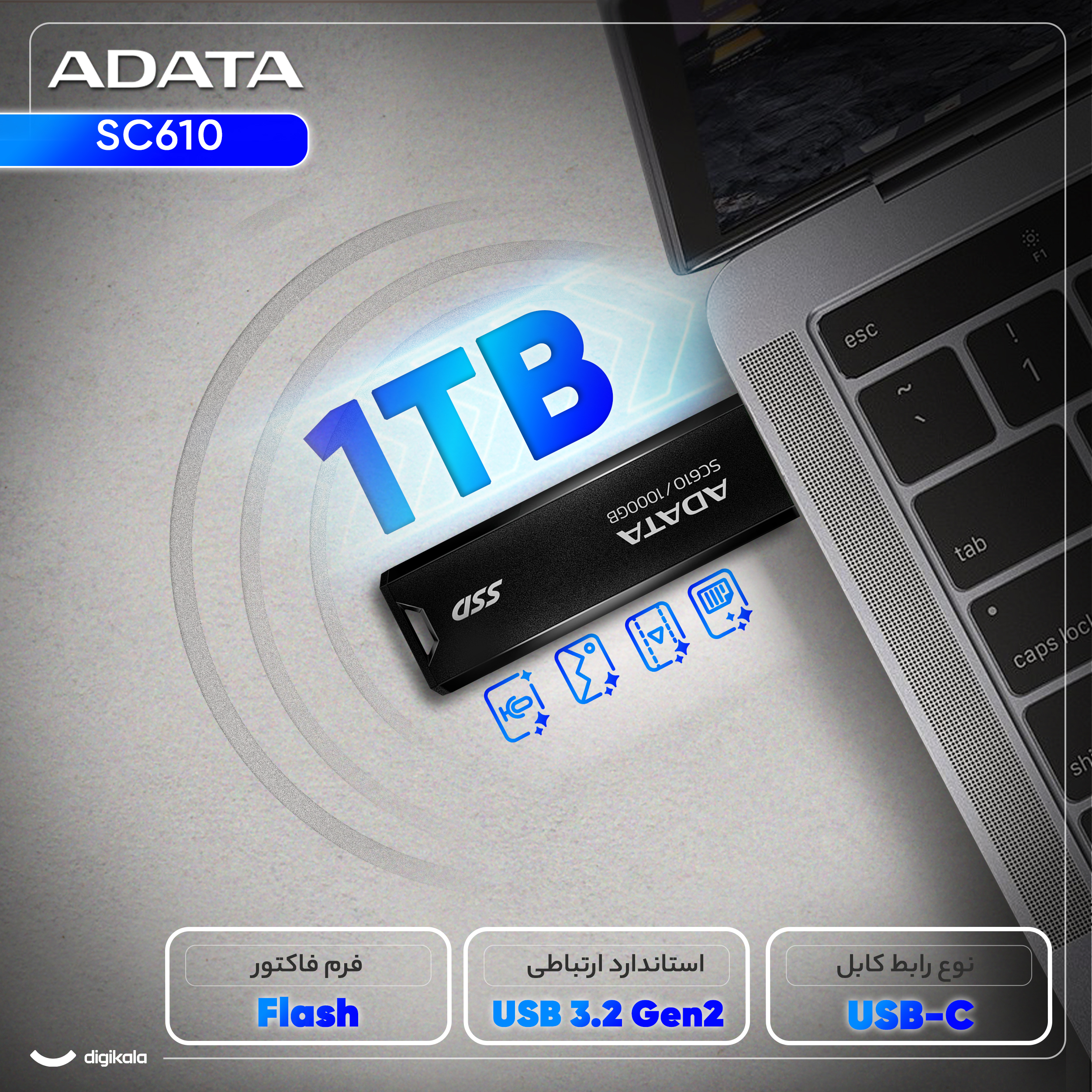 بهترین قیمت اس اس دی اکسترنال ای دیتا مدل SC610 ظرفیت 1 ترابایت رابط USB 3.2 Gen2 ارسال سراسر ایران