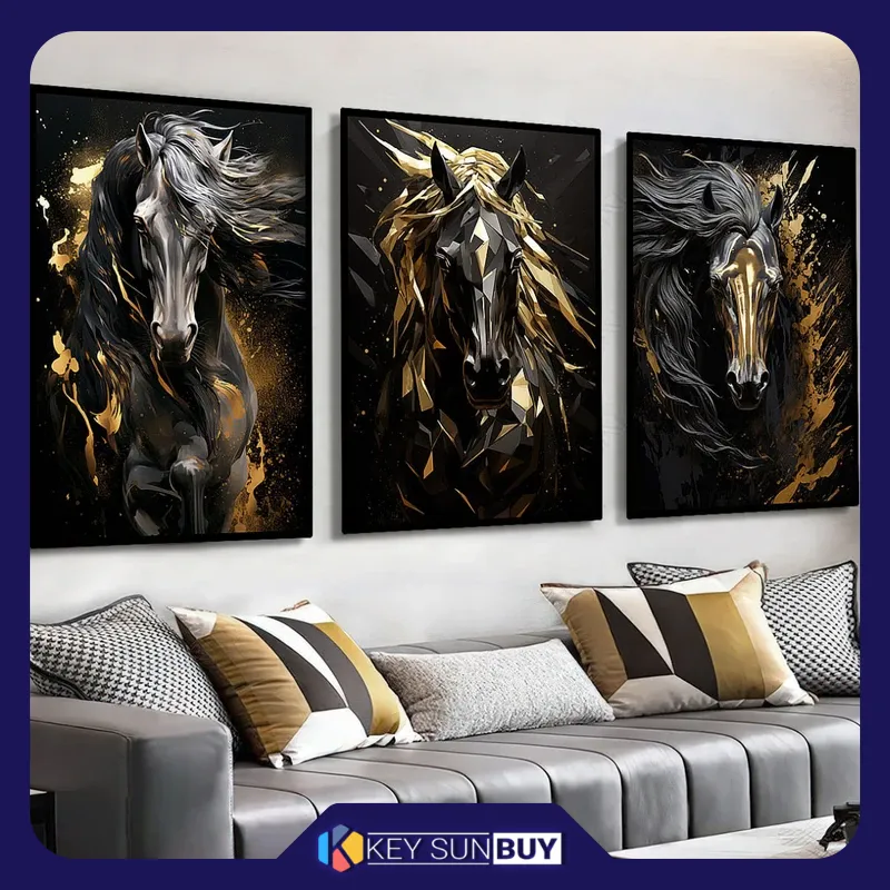 بهترین قیمت تابلو طرح دکوراتیو اسب کد 4180B با فریم مشکی مجموعه سه عددی ارسال سراسر ایران