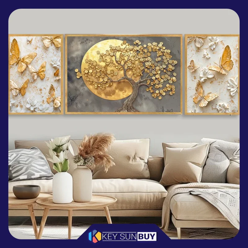 بهترین قیمت تابلو طرح دکوراتیو طبیعت مدل درخت و گل کد 1525 فریم طلایی مجموعه سه عددی ارسال سراسر ایران