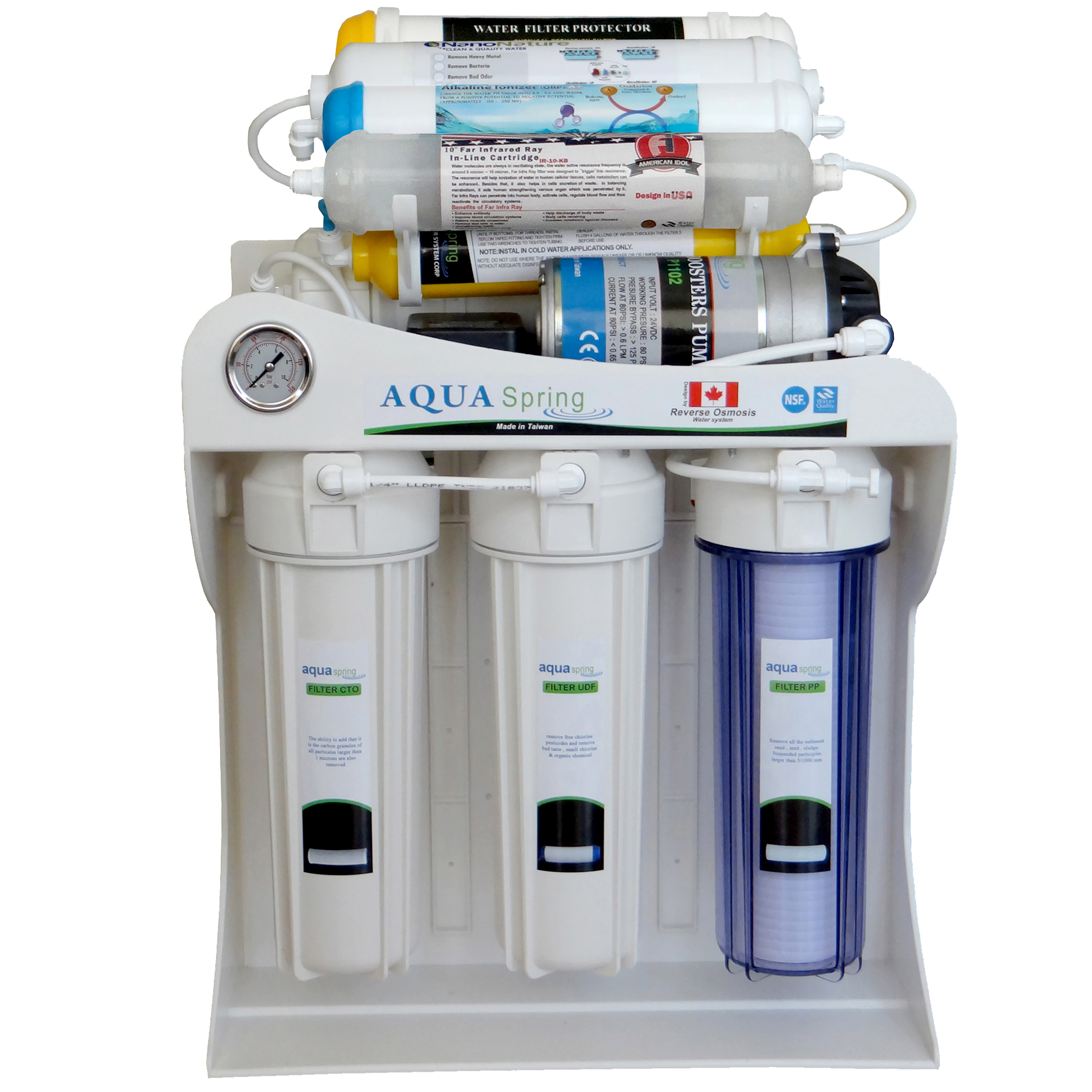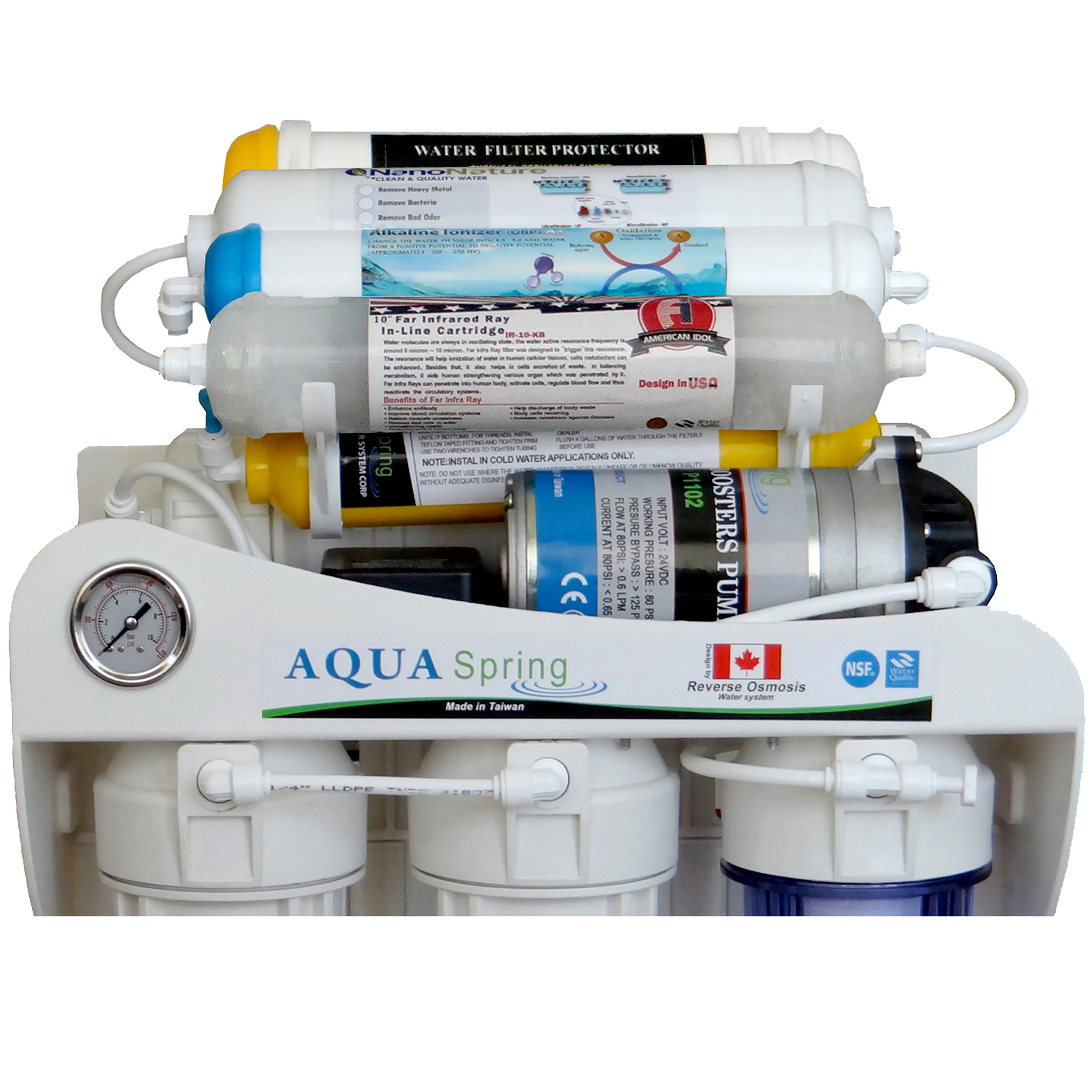 دستگاه تصفیهآب خانگی با برند معتبر اکوآاسپرینگ مدل NF – SF4200 ده مرحلهای و دارای باکیفیتترین و بروزتری ده مرحلهای و دارای باکیفیتترین و بروزترین تکنولوژی در فرایند دستگاههای تصفیهآب خانگی است. در این دستگاه از متریال و هوزینگهای فودگرید، فیلترهایی برپایه گیاهی، مخزن آنتیباکتریال 16 لیتری، مگابوستر پمپ قوی بافشار 125 PSI و شیر جداگانه برخوردار است.