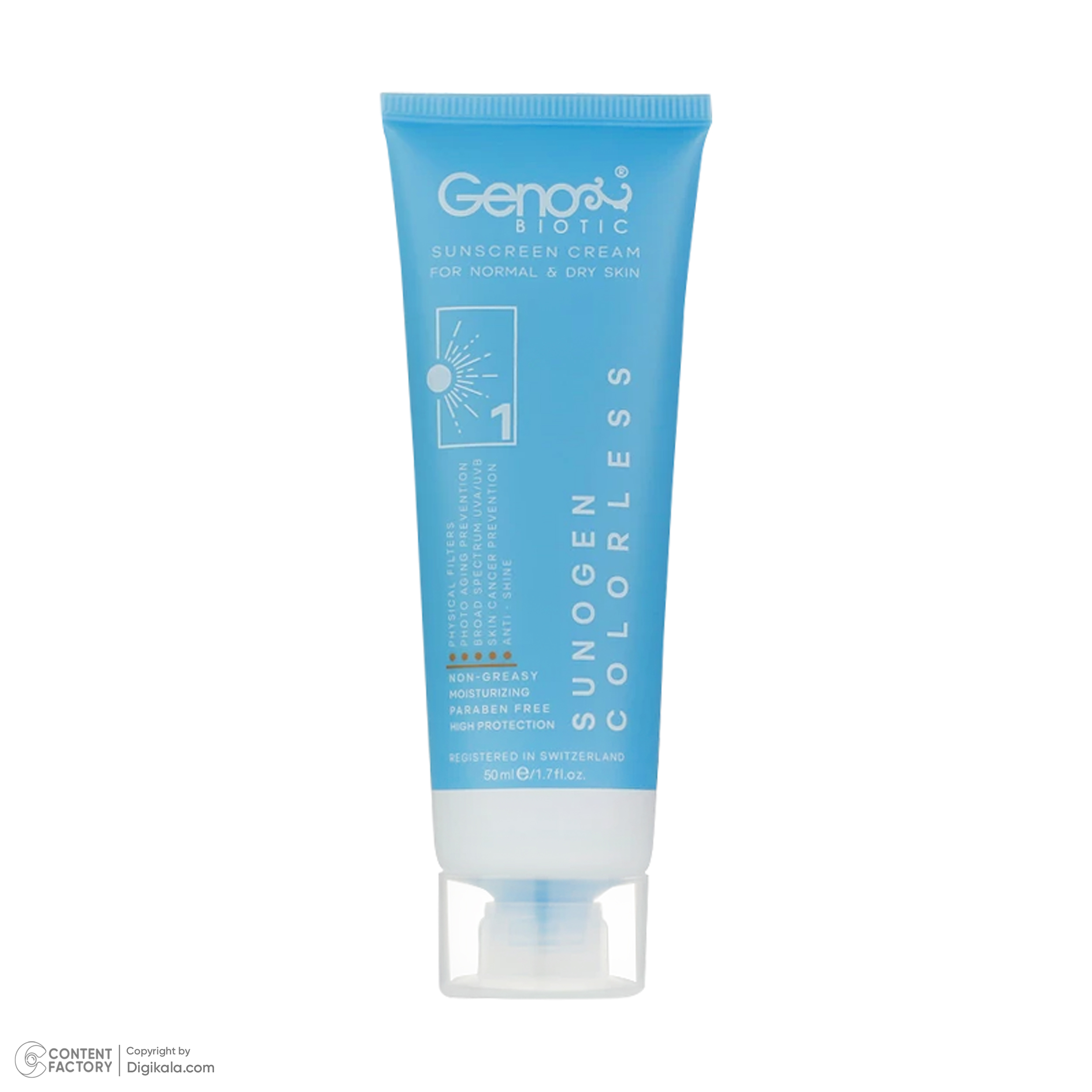 مراقبت پوست کرم ضد آفتاب بدون رنگ ژنوبایوتیک SPF50 مدل 01 محافظ UVA ،UVB، ضد آب، مرطوبکننده، مناسب پوستهای خشک و معمولی حجم 50 میلیلیتر