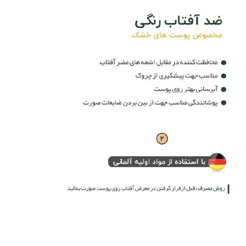 - راهنمای استفاده:قبل ازقرار گرفتن در معرض آفتاب روي پوست صورت بمالید