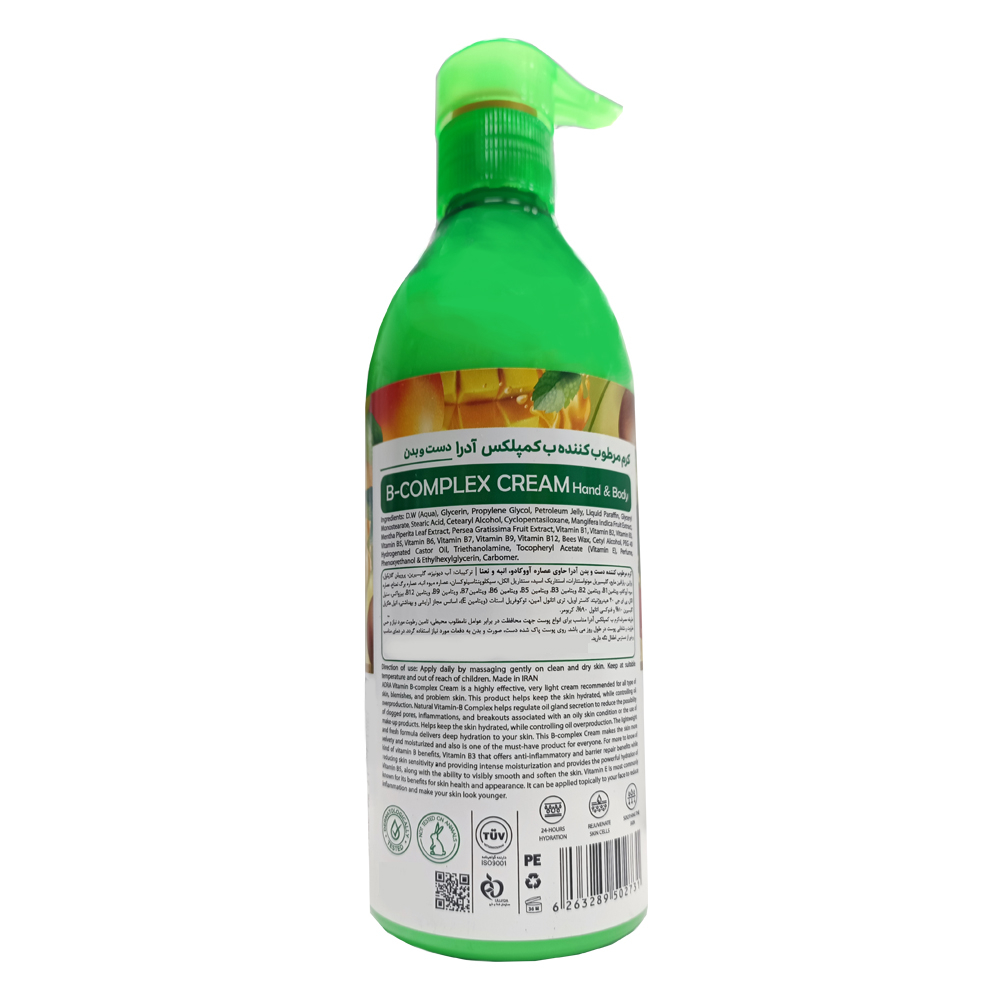 کرم مرطوب کننده ب کمپلکس آدرا حاوی عصاره آووکادو، انبه و نعنا بوده و برای انواع پوست مناسب است. این محصول به واسطه فرمولاسیون خود غنی از ویتامین های گروه B برای حفظ سلامت پوست بوده و غذایی کاملی برای پوست محسوب می شود. این کرم از پوست در برابر عوامل نامطلوب محیطی محافظت می کند.