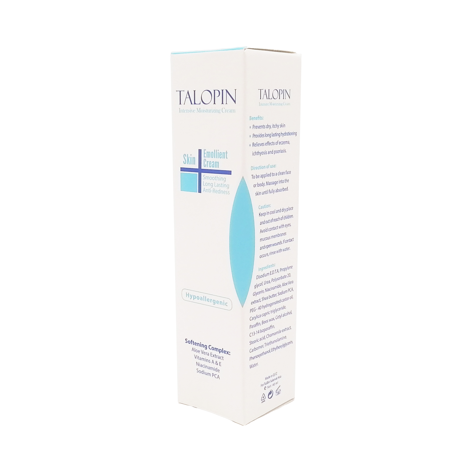 کرم مرطوب کننده تالوپین مجموعهای از ترکیبات مرطوب کننده و آبرسان پوست است که به علت دارا بودن بافتی سبک، به سرعت جذب پوست شده و بدون به جا گذاشتن اثر چربی و سنگینی روی پوست، رطوبت مورد نیاز پوست را به صورت موثر و به مدت طولانی تامین مینماید. این کرم فاقد مواد کومدوژن بوده و تولید آنتی بیوتیکهای طبیعی پوست را افزایش میدهد و از ایجاد آکنه جلوگیری میکند و به همین دلیل در برطرف کردن خشکی پوست که پس از برخی درمانهای ضد آکنه به وجود میآید، بسیار موثر است. کرم مرطوب کننده تالوپین با افزایش سنتز کلاژن استحکام و تونیسیته پوست را نیز افزایش میدهد.کرم مرطوب کننده تالوپین با ایجاد لایه جدید روی پوست از خروج رطوبت آن جلوگیری میکند و پوست لطیف و نرم به نظر میرسد.